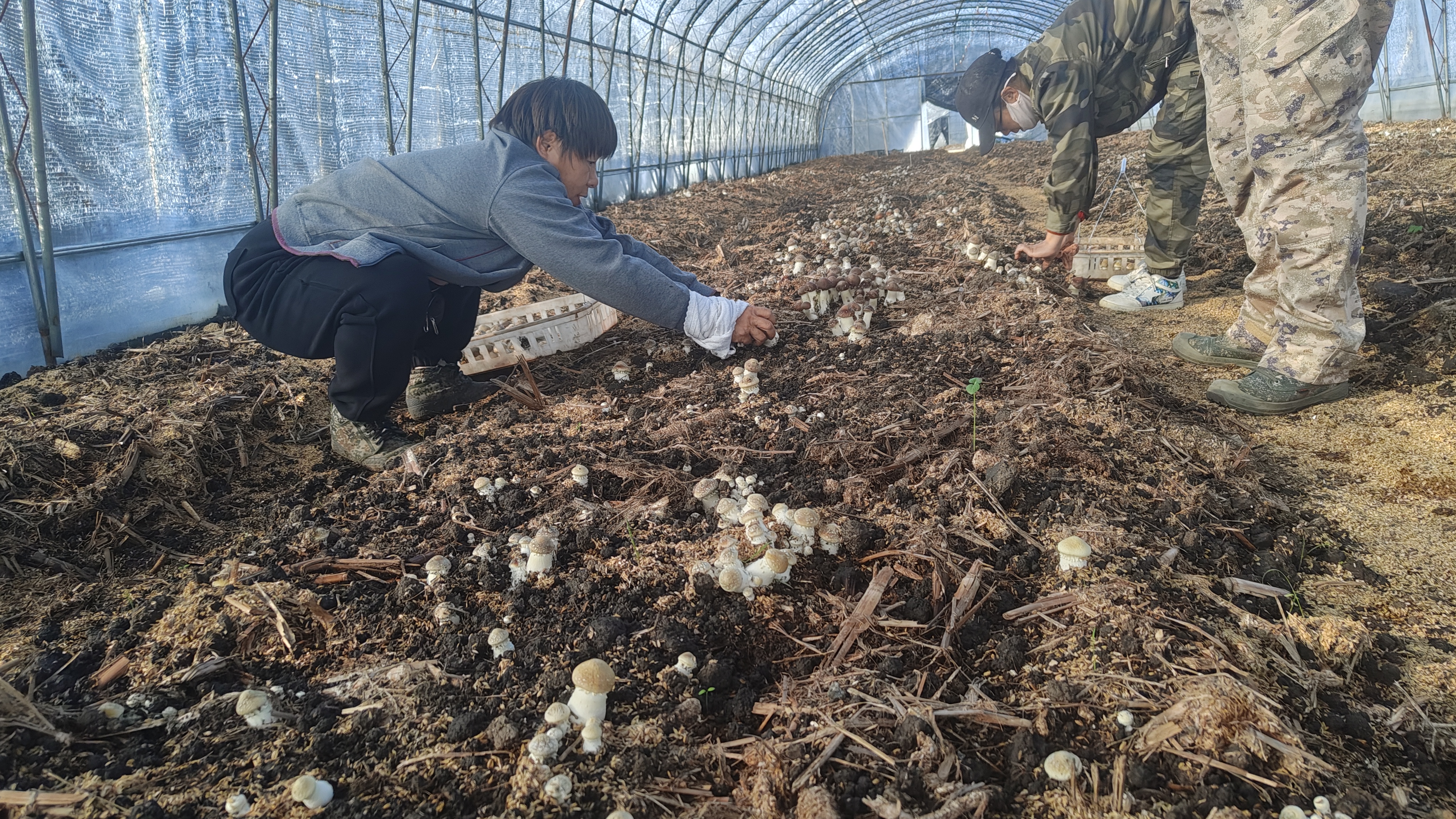 大棚里,一片片秸秆堆成的垄田上,菌杆白色、伞面赤红褐色的赤松茸成群探出“头”来,在阳光的照耀下破土而出,浑圆饱满,甚是可爱。工作人员穿梭在大棚内,轻轻扭动赤松茸的根部,小心摘下并整齐摆放在身旁的篮子里。