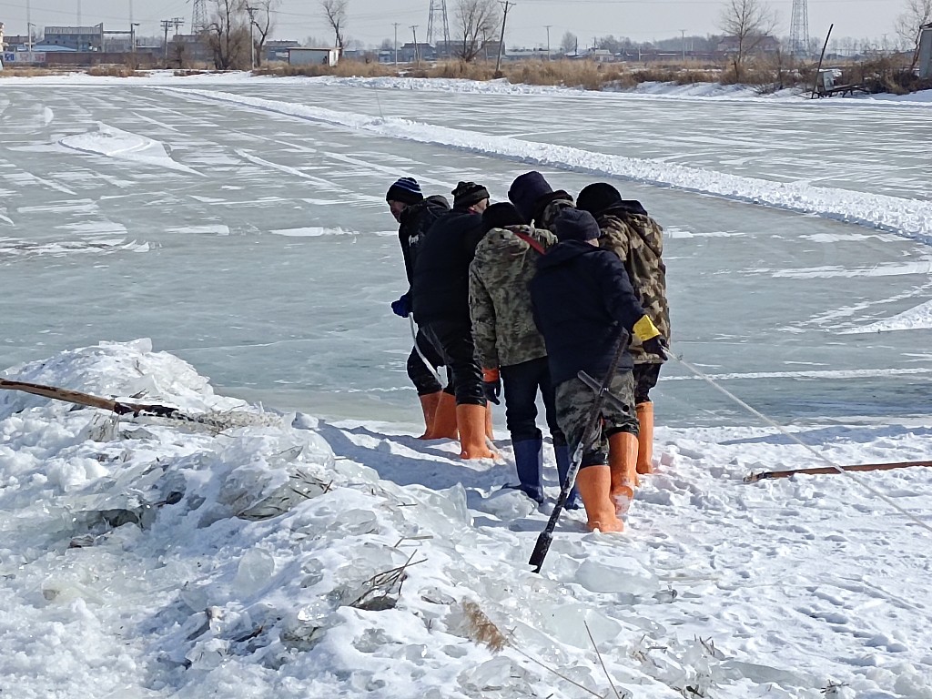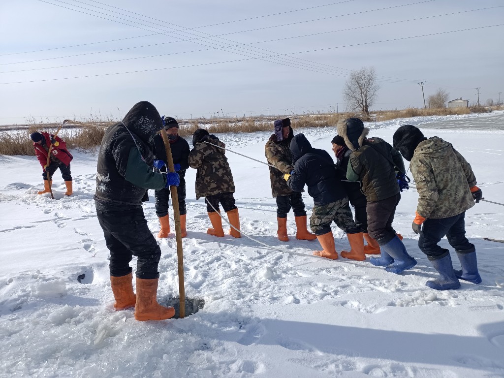 2023年2月19日上午,肇东市涝洲镇合居村村外的一处鱼塘,11名专业打冬网的壮汉正在凿冰钻眼,穿线布网。在15亩鱼塘捕获2万斤鱼是这一网的目标。