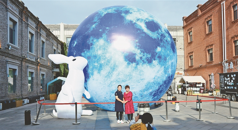 在中华巴洛克街区打卡圆月。 本报记者 张澍摄