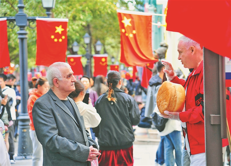 在中央大街处处是“中国红”和人声鼎沸的热闹场面。市民和游客在街上观光游览,在节日中感受喜庆气氛。图为中央大街上的游客。本报记者 蒋国红摄