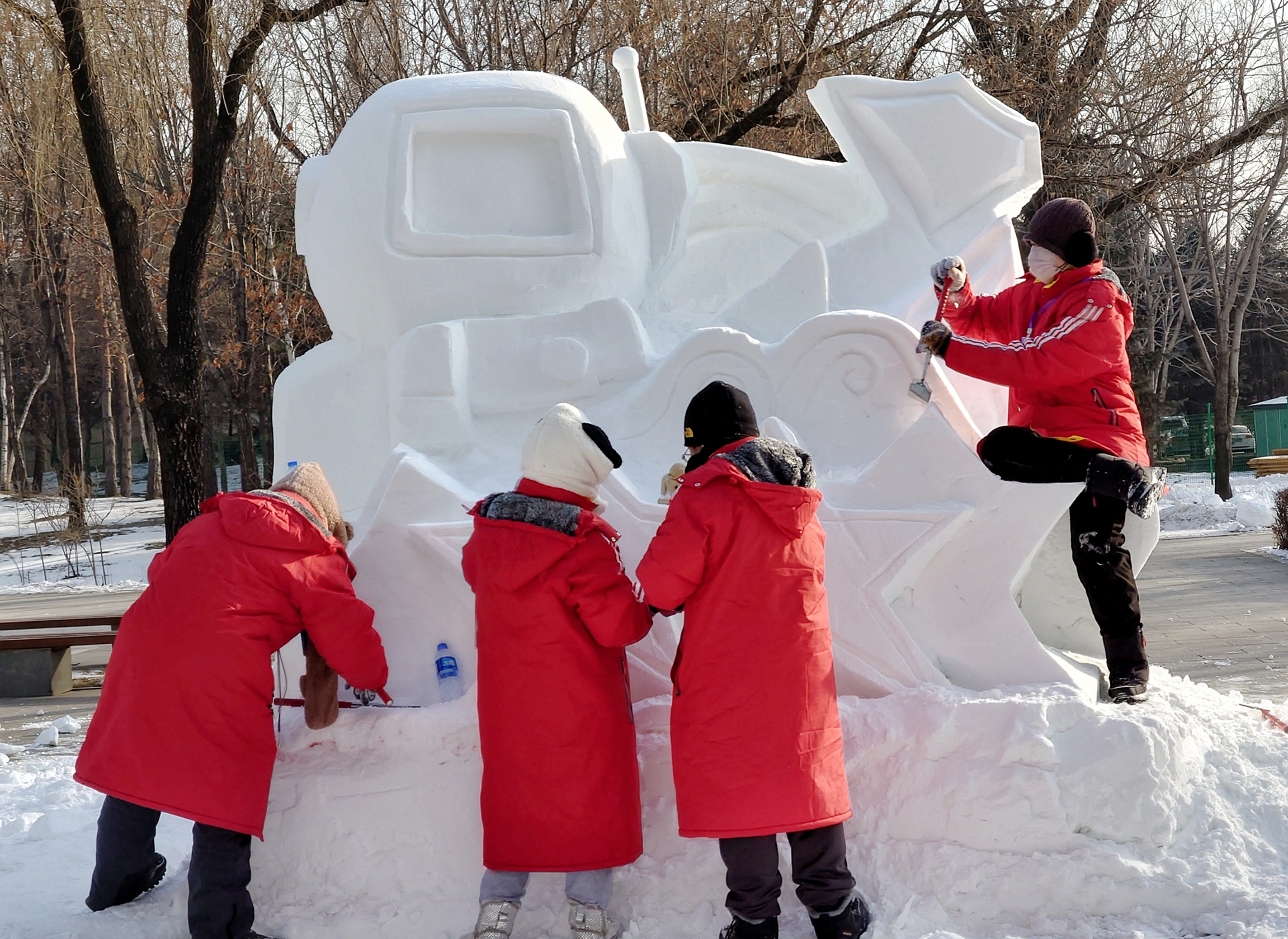 大学生打磨雪雕作品