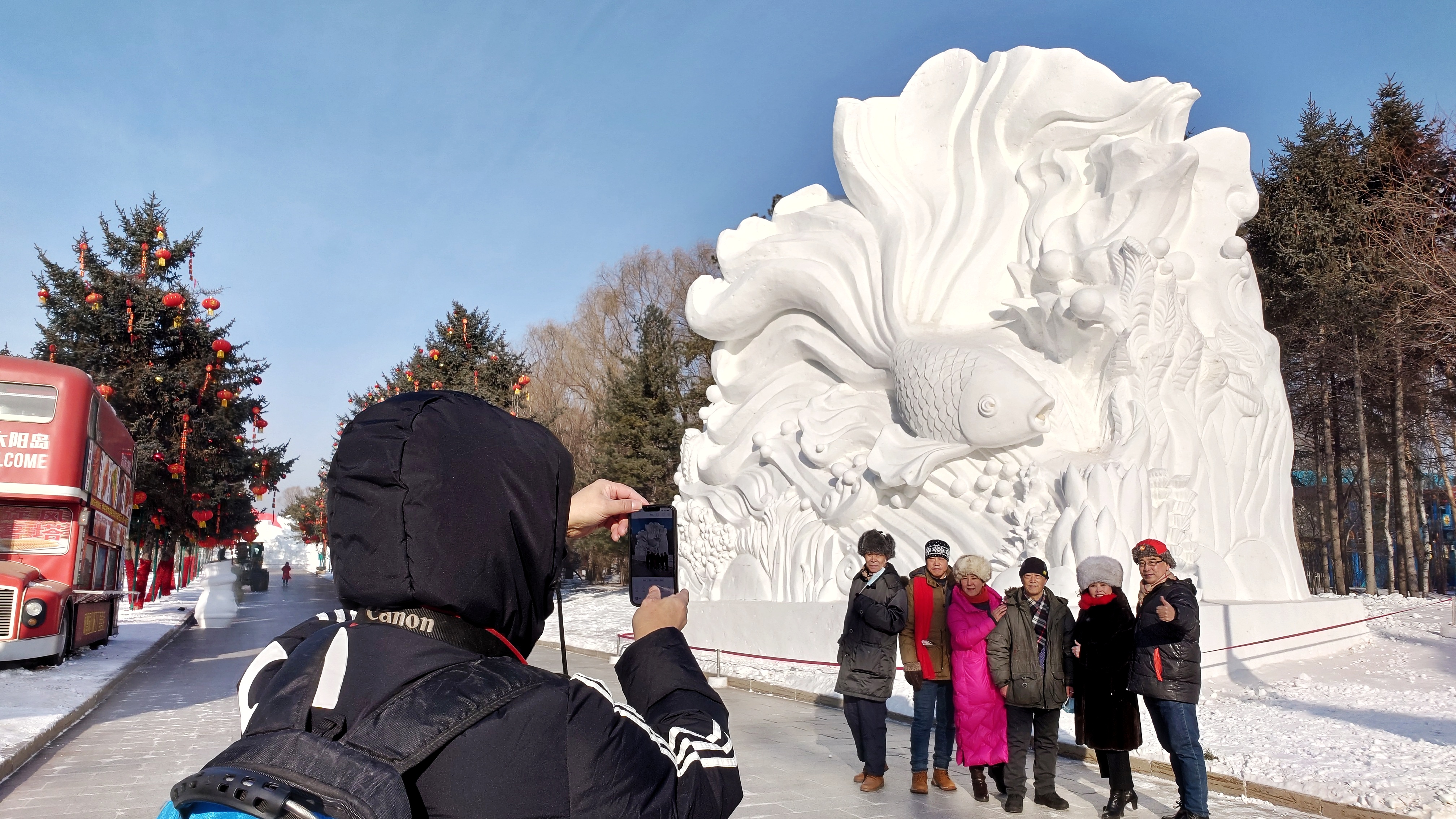“这个鱼雕得太好看了,快给我拍张照!”12月20日,第35届中国·哈尔滨太阳岛国际雪雕艺术博览会预开园。游人和市民三三两两陆续走进太阳岛雪博会,或乘坐电瓶车,或徒步欣赏美丽的雪塑盛宴。