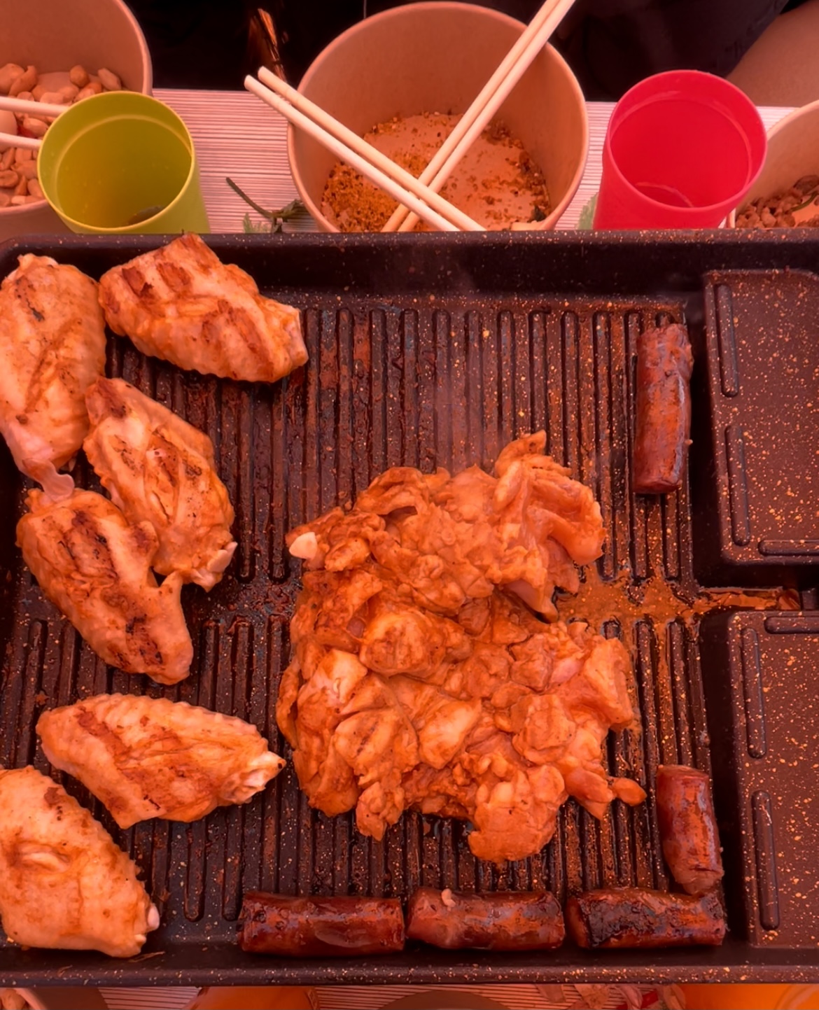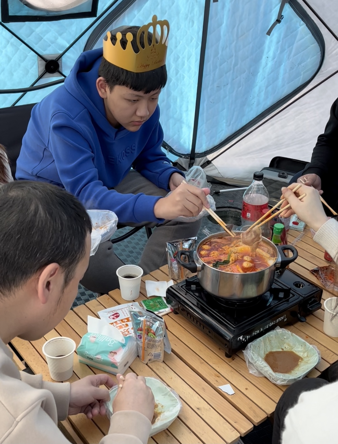 记者看到,50多顶帐篷伫立在冰面上,像散落的星辰般璀璨。邂逅一场纷飞的大雪,这里让喧嚣的一切变得宁静、浪漫。打开帐帘,暖意融融。来看看东北冰钓的帐篷里都有啥:电暖气、炉具、餐桌、游戏桌……火锅、烤肉、鱼宴,妥妥都能安排上。另一顶帐篷里正在举行“冰钓生日派对”,充分体验冰火两重天的奇妙。