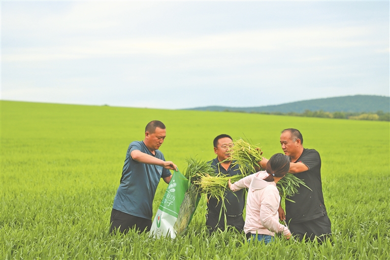 黑龙江省农垦科学院作物研究所所长王平及其团队也奔波在农场的示范田里。在农场精心打造的大麦试验示范区和大豆高产核心示范田里,专家们仔细查看大豆、大麦、小麦等作物的株高、密度、叶色,认真分析不同区域、不同品种的差异表现。他们实地测量土壤墒情,结合耕层质地、已实施的技术措施、示范推广面积以及预期的产量效益等要素进行综合评估,对大麦和小麦进行测产。