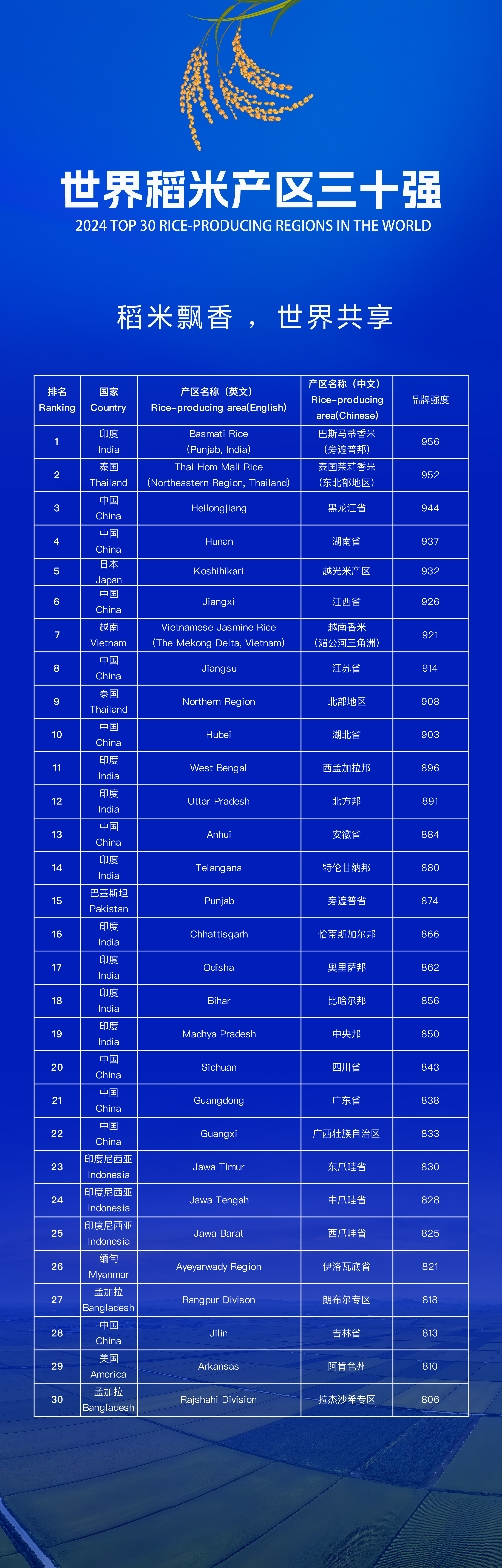 此次大会上,国际品牌科学院揭晓了世界稻米产区三十强榜单,黑龙江省位列第3名。华侨大学国际品牌研究院发布了世界稻米地理标志(县域)品牌百强榜单,庆安大米位列第2名。两项榜单亮相中国农民丰收节,不仅是对全球稻米产业的一次全面检阅,更是对未来发展方向的引领,对于推动稻米产业的品牌化、标准化、国际化进程起到了重要作用。