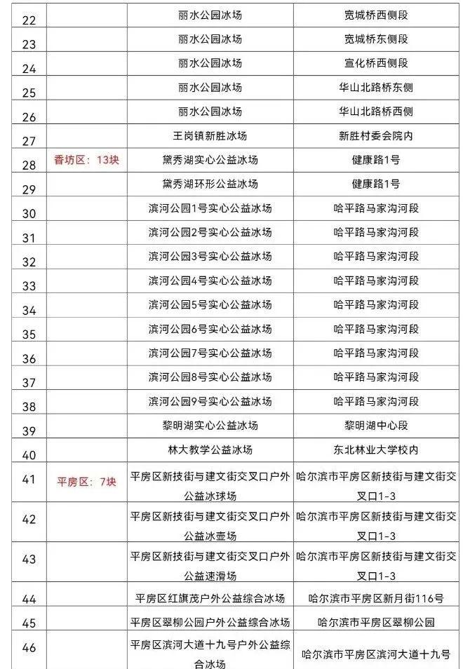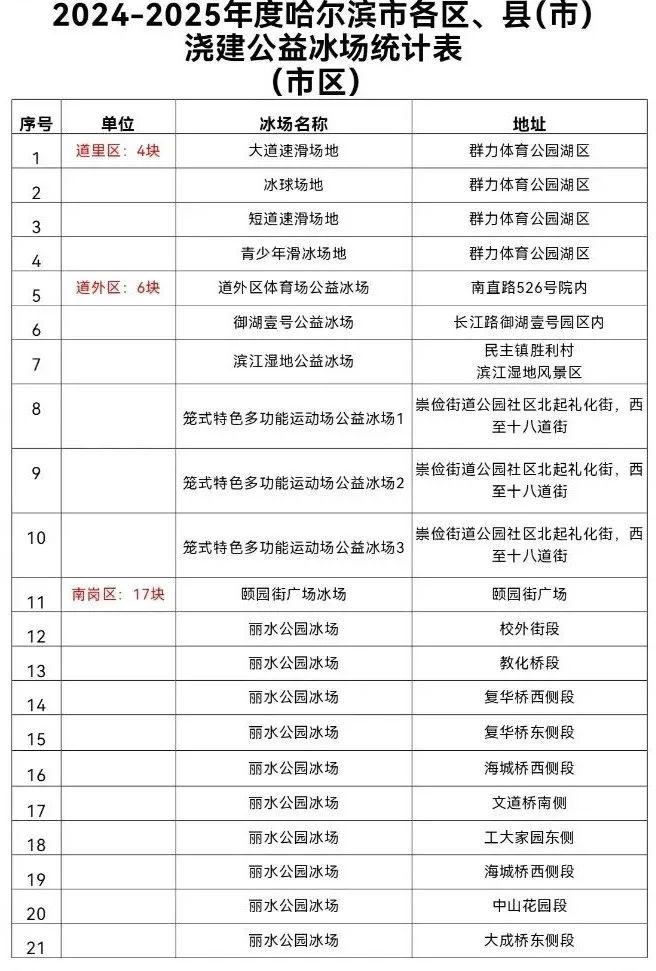 今冬,哈尔滨市各区县(市)利用辖区街边、公园、广场等场地建设110余处公益冰场,将在2025年1月5日前陆续亮相。