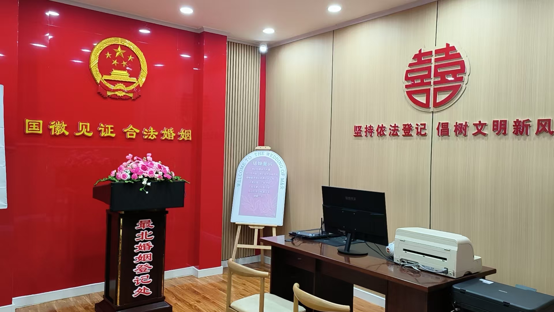 置身如诗如画的美景中,让婚姻登记不再仅仅是一个程式化的流程,而是一场充满诗意与温情的神圣仪式。来到漠河北极村景区的人们惊喜地发现,景区中心北极村广场旁又增添了一处新的打卡地——北极村婚姻登记处。这个中国最北婚姻登记处今年6月揭牌,至今已有15对新人在此办理了结婚登记,更多的游客慕名而来打卡留念。