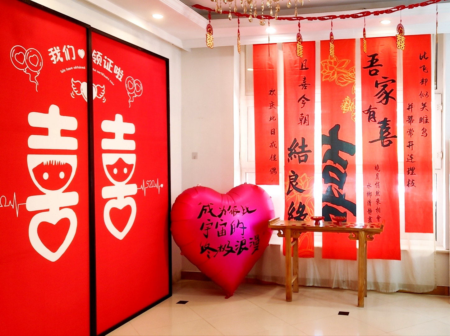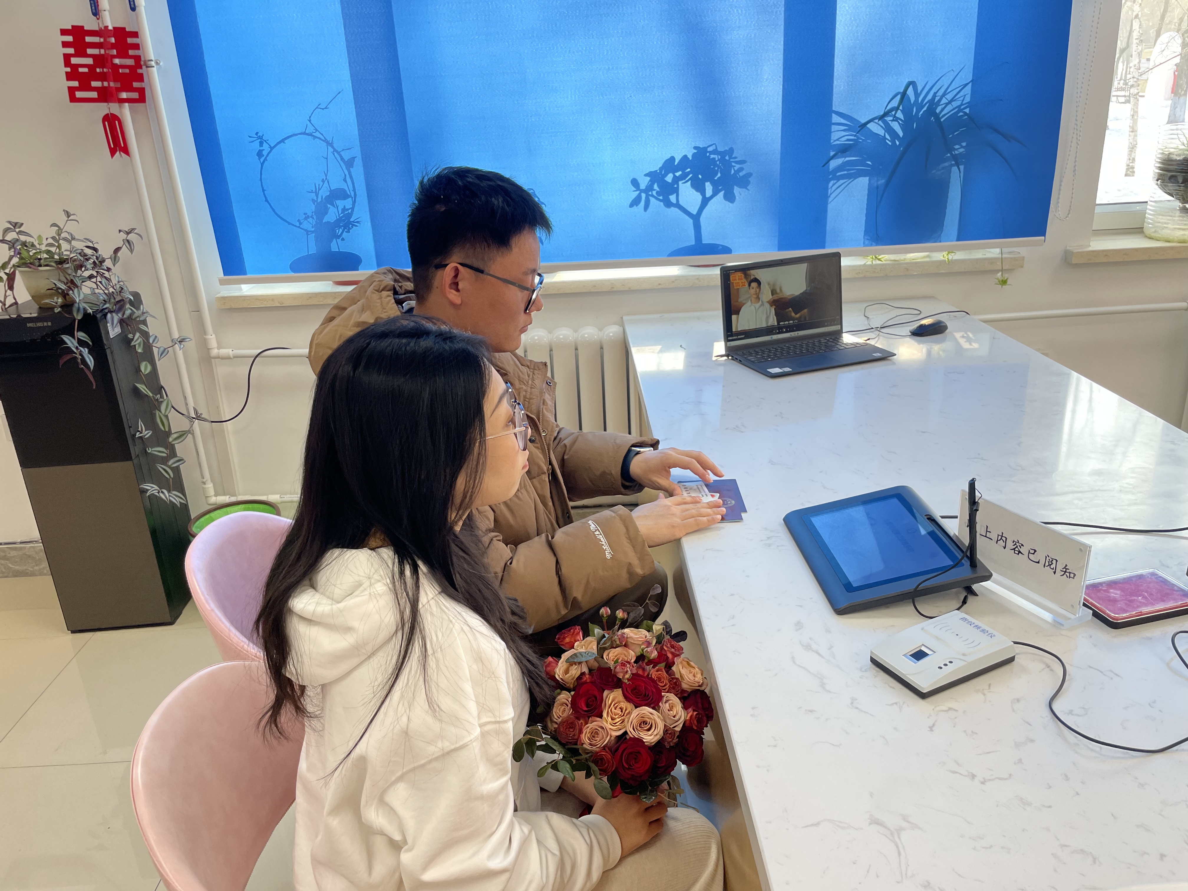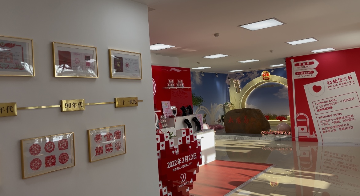 大红色的喜字、一颗颗红心、粉红色的玫瑰和气球……太阳岛婚姻登记处内装饰得温馨浪漫。工作人员首先安排新人观看婚姻家庭宣传片,对新人进行婚姻家庭辅导。随后,二位新人进行结婚登记,并在零彩礼签名墙上落笔承诺。在共同宣讲结婚誓言后,工作人员为新人颁发结婚证。手捧大红本,二位新人热烈相拥。郑紫嫣的父母见证了这一幸福时刻,在女儿开启人生新起点的时刻送上了诚挚的祝福。郑紫嫣的母亲车晶感慨地说:“现在跟我们那个年代比进步了很多,到公园登记结婚,适合年轻人的情感需求,为他们提供了满满的情绪价值。”