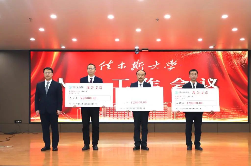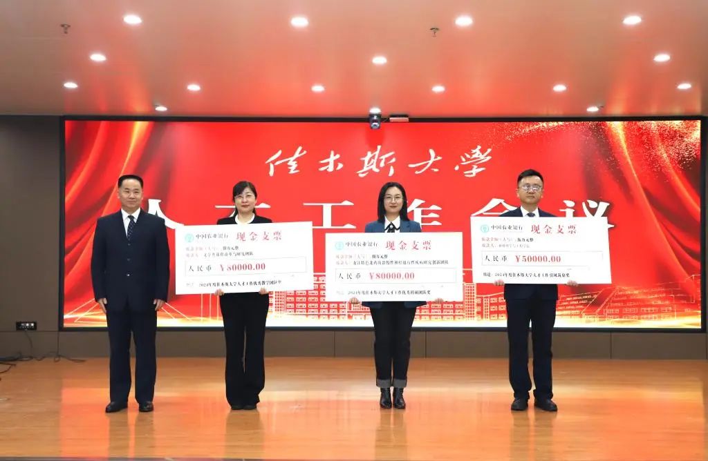会议现场,佳木斯大学为荣获引凤筑巢奖、优秀科研团队奖、优秀教学团队奖、优秀科研人才奖、优秀教学人才奖、优秀社会服务个人奖的集体和个人颁奖。