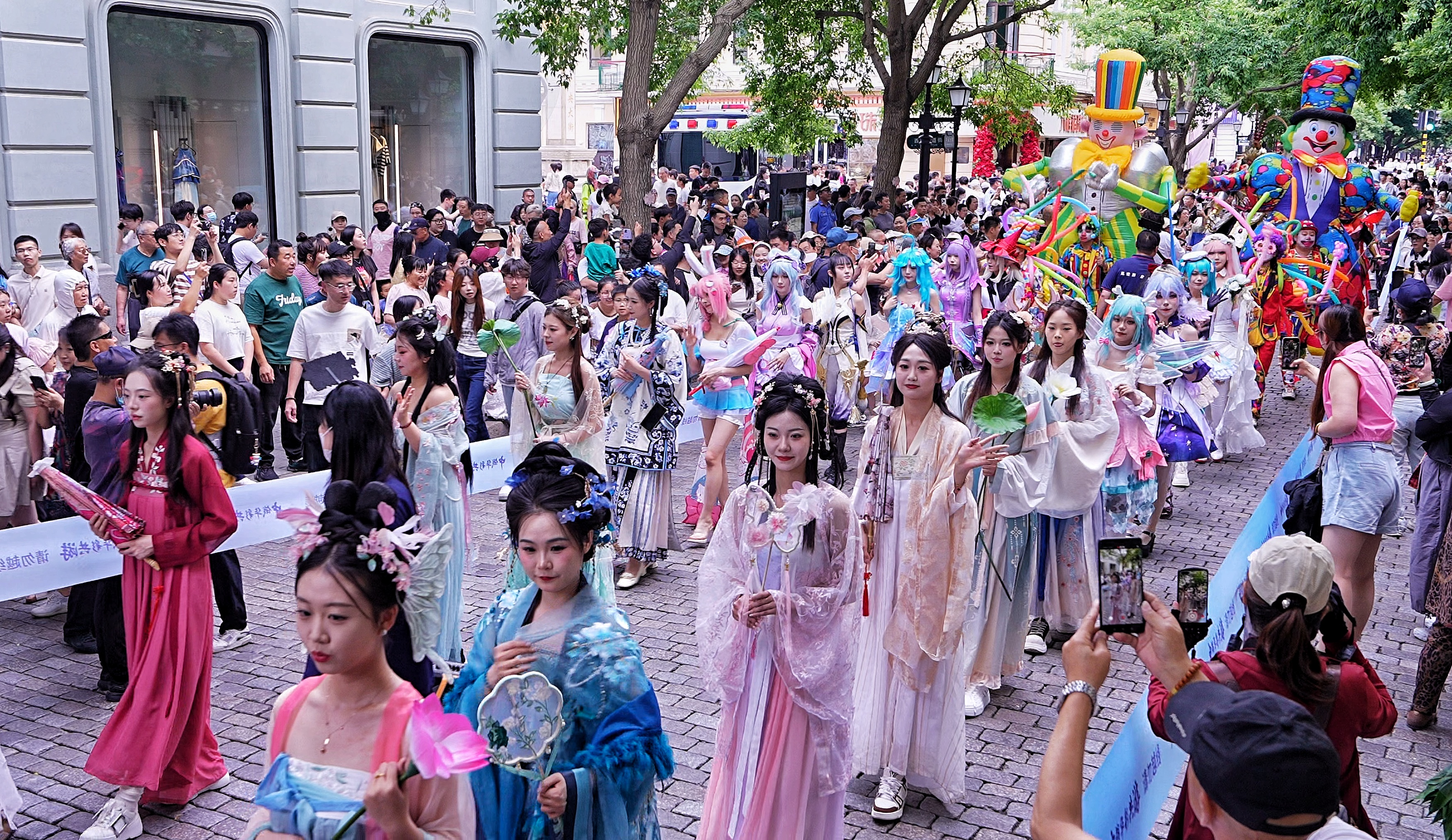 活动现场,中俄文化元素交相辉映,营造出浓厚的艺术氛围。中华传统文化大放异彩,汉服巡游队伍缓缓前行,古典雅致的汉服与中央大街的欧式建筑相互映衬,展现出独特的东方韵味。