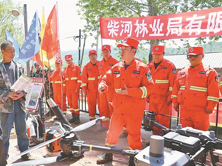 2025年春季防火关键期,柴河局公司消防大队队员在青梅林场设置宣传点,向过往群众发放森林防火相关宣传刊物,并耐心讲解防火注意事项。现场特别设置的互动体验区吸引众多群众驻足,消防队员现场演示无人机巡护操作,高清镜头实时传回林区全景画面,让居民直观感受“科技翅膀守护绿水青山”的现代化防火模式。