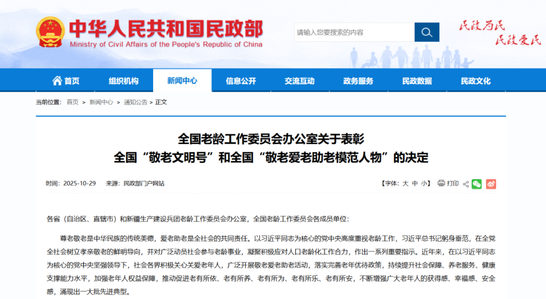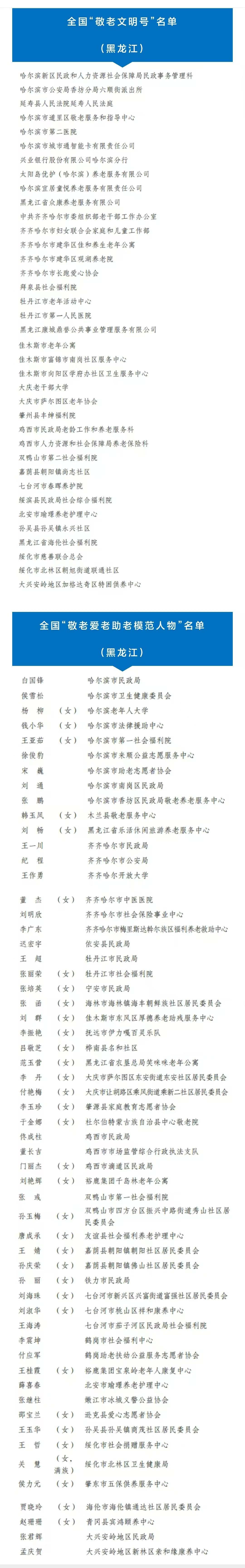 近日,民政部网站发布《全国老龄工作委员会办公室关于表彰全国“敬老文明号”和全国“敬老爱老助老模范人物”的决定》。经逐级推荐、审核和公示,现决定,授予1290个集体全国“敬老文明号”称号,授予1990名个人全国“敬老爱老助老模范人物”称号。其中,黑龙江37个集体、57名个人入选。
