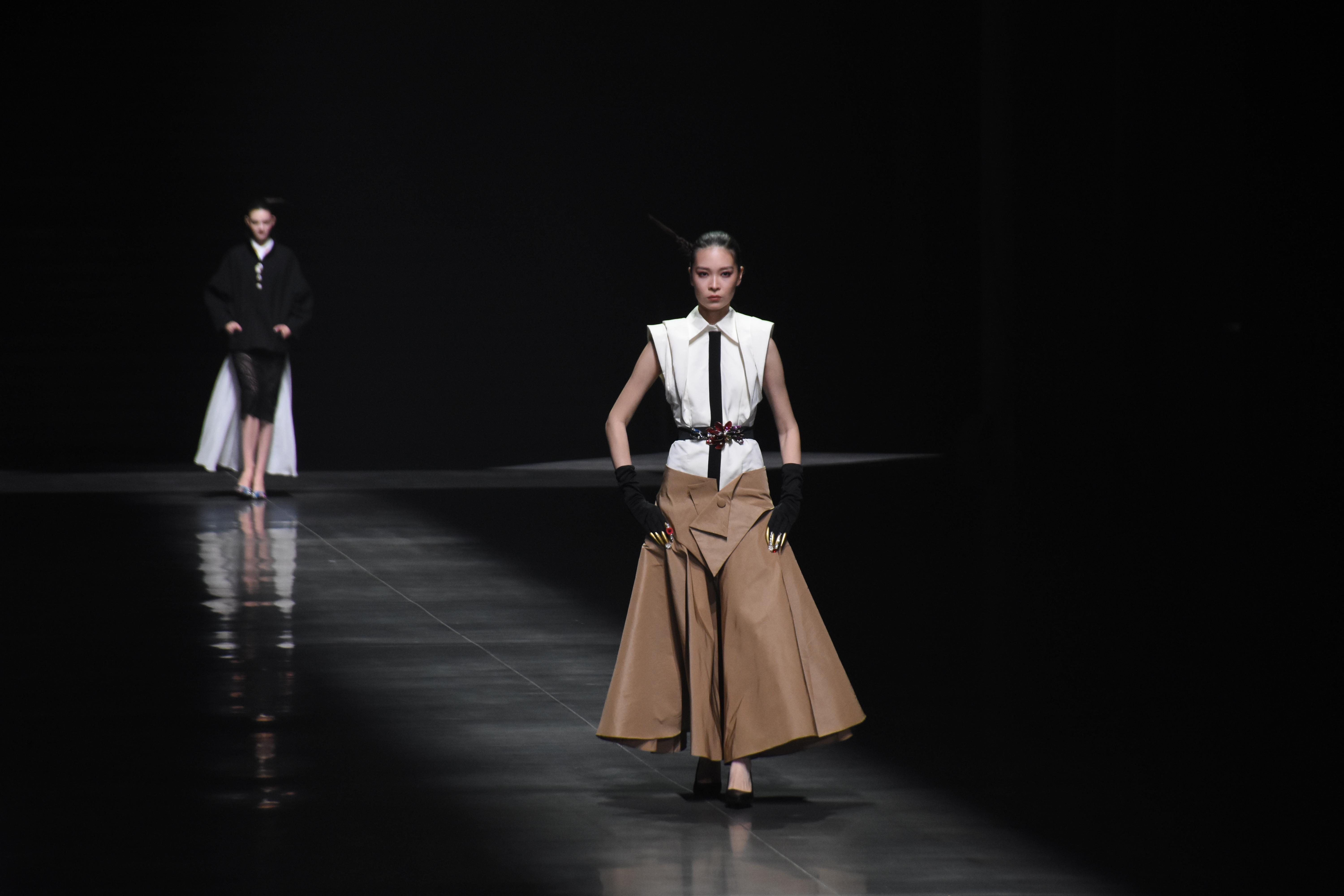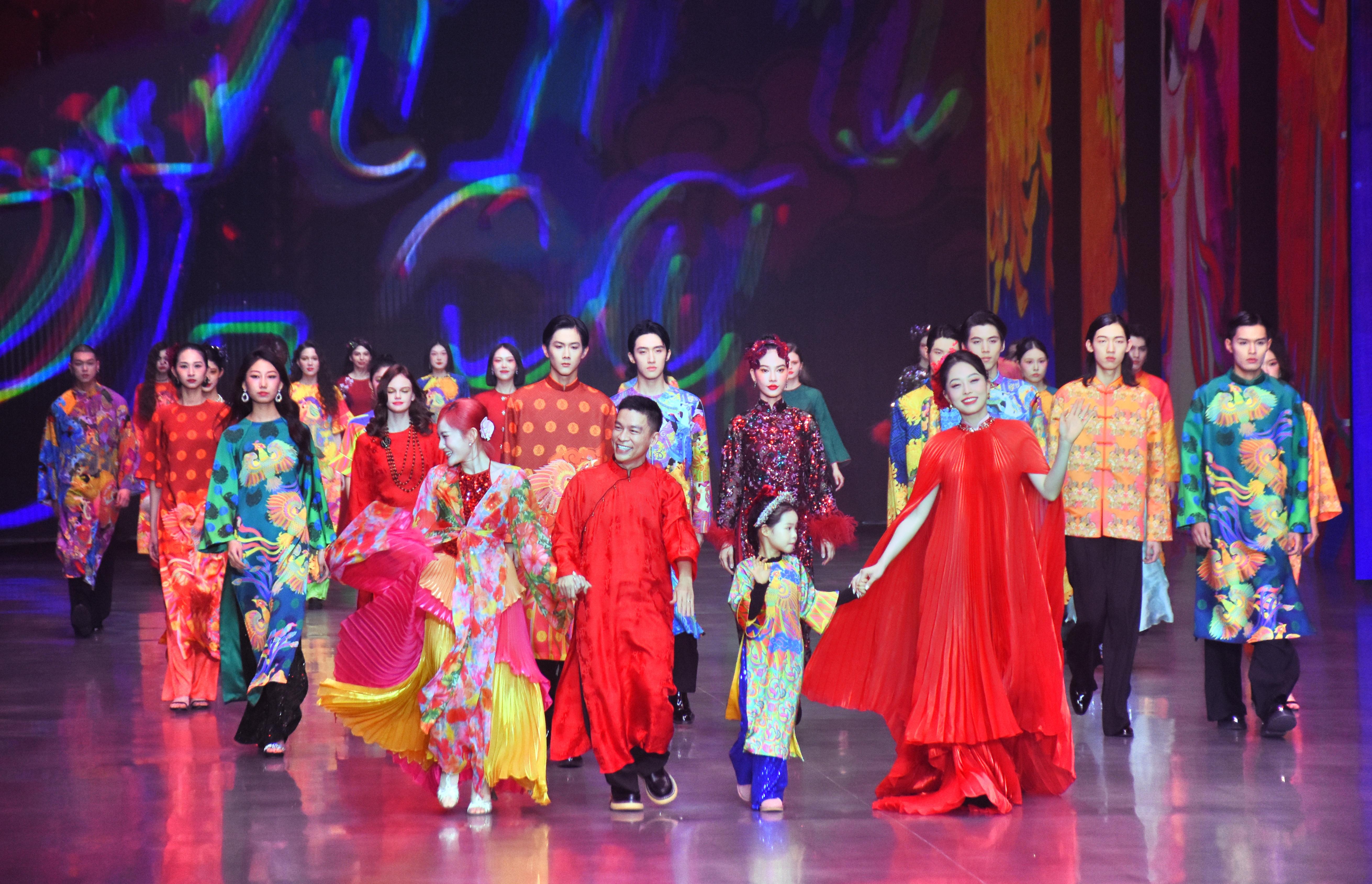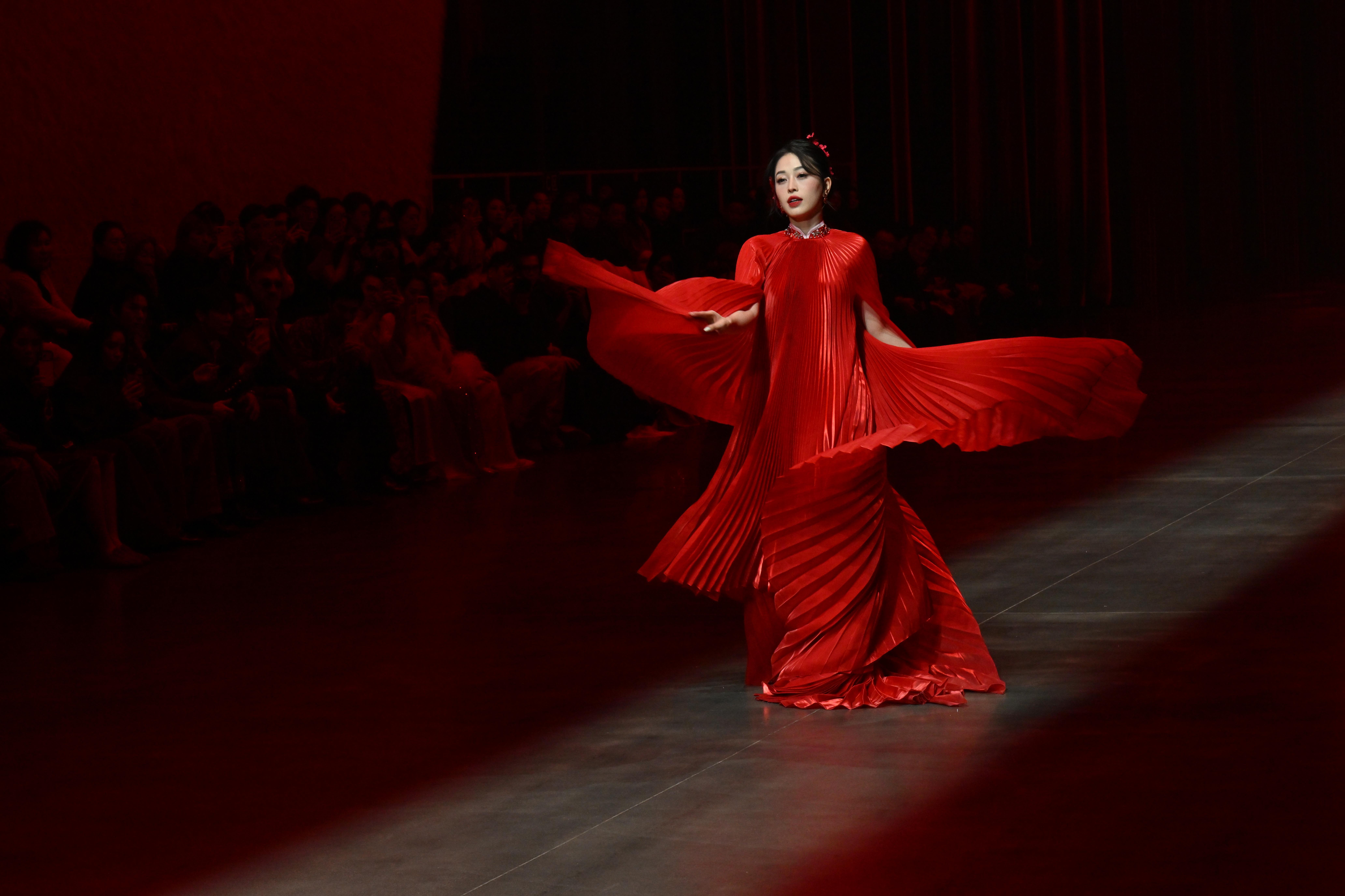 红调光束从场馆钢架间垂落,将T台染成一片炽热的绯色,模特们身着越南设计师Adrian Anh Tuan创立的品牌Valenciani服饰走上T台,服饰将刺绣、盘扣等元素与夸张的廓形、撞色拼接融合,大朵印花纹样在明黄、宝蓝、正红的面料上肆意绽放,透露着越南传统的细腻质感,又融入西方高级时装的结构感与当代审美。