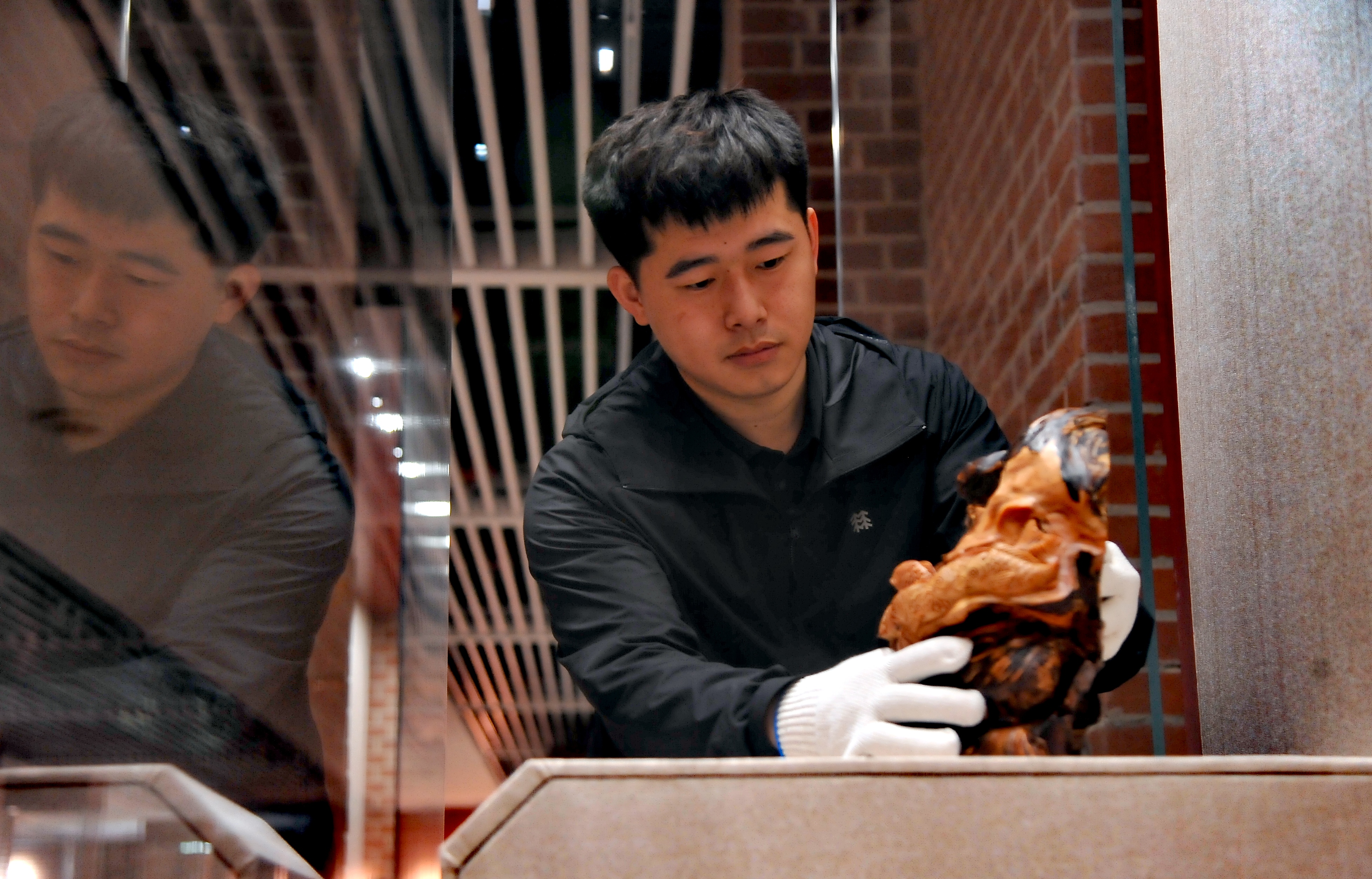 二楼主要展示朱炳仁铜艺作品和省内13个地市的非遗作品,包括哈尔滨市的金漆镶嵌工艺、齐齐哈尔市的龙江剪纸等。