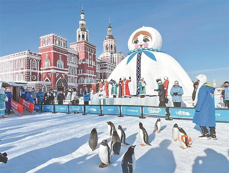 企鹅们与伏尔加大雪人同框。图片由景区提供