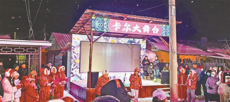 “没想到在深山里能看到这么美的烟花,太有氛围感了!”来自上海的游客李女士举起手机记录下这浪漫瞬间,言语间满是赞叹。烟花散去,卡尔民宿内已是人声鼎沸。东北二人转演员身着特色服饰登台,诙谐的台词、地道的唱腔引得台下掌声不断,游客们不时跟着哼唱互动;室外的空地上,大秧歌队扭动着欢快的舞步,红绸飞舞间,不少游客主动加入队伍,跟着鼓点迈开脚步,生疏却热情的动作引得众人欢笑连连。