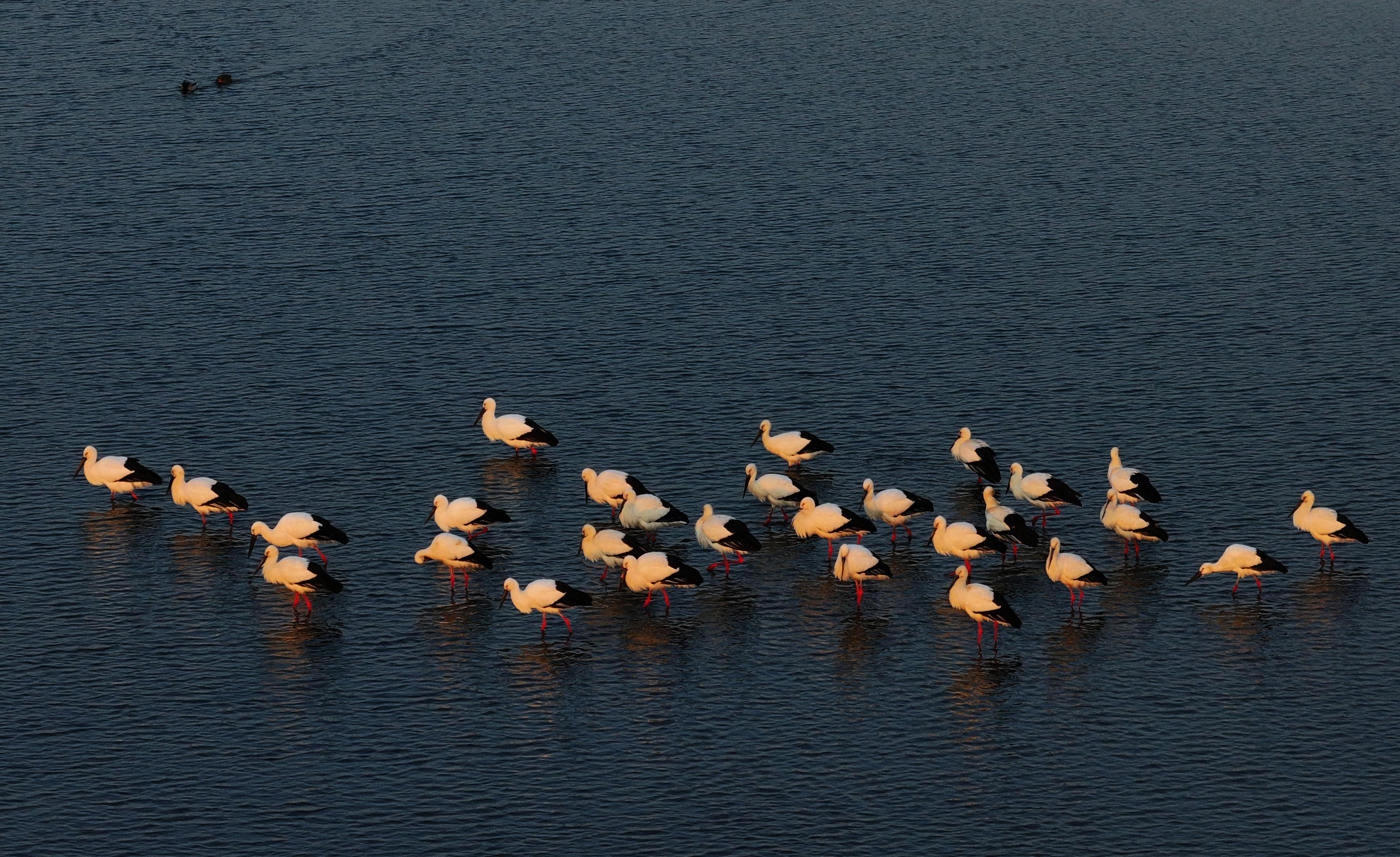一群白琵鹭与苍鹭、东方白鹳在江面停歇