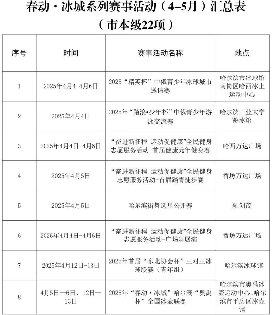 为充分发挥“亚冬效应”,延续亚冬会带来的体育热度,哈尔滨市启动“春动·冰城”系列赛事活动。在4至5月的春季时段,哈尔滨市将组织48项体育赛事活动,全力推动体育事业发展,提升城市体育影响力。这是记者从哈尔滨市体育局9日召开的2025年“春动·冰城”赛事活动新闻通气会暨体育联合项目签约仪式上获悉的。