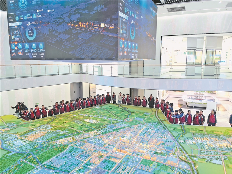 桦南县全域三维立体沙盘模型前,学生们感受新型城市功能单元。