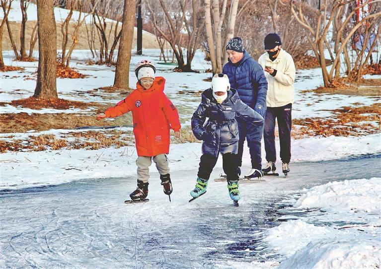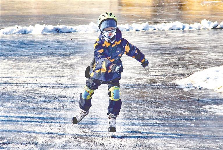 日前,哈尔滨市道里区丁香公园南侧的近200平方米的小湖上,许多市民利用周末时间带着孩子在练习滑冰,抽冰尜。公园北侧近万平方米的大湖上,工人们正在进行公益冰场的建设。工人将湖面的积雪收集起来制成半米多高的雪墙,用来将儿童初学区、快速滑道等区域分隔开,之后还将进行平整冰面、浇冰等工作。目前公益冰场的施工已完成过半,再过几天即可建成投用。到时候,市民和游客们可以来到这处大冰场滑冰,感受滑冰的乐趣。
